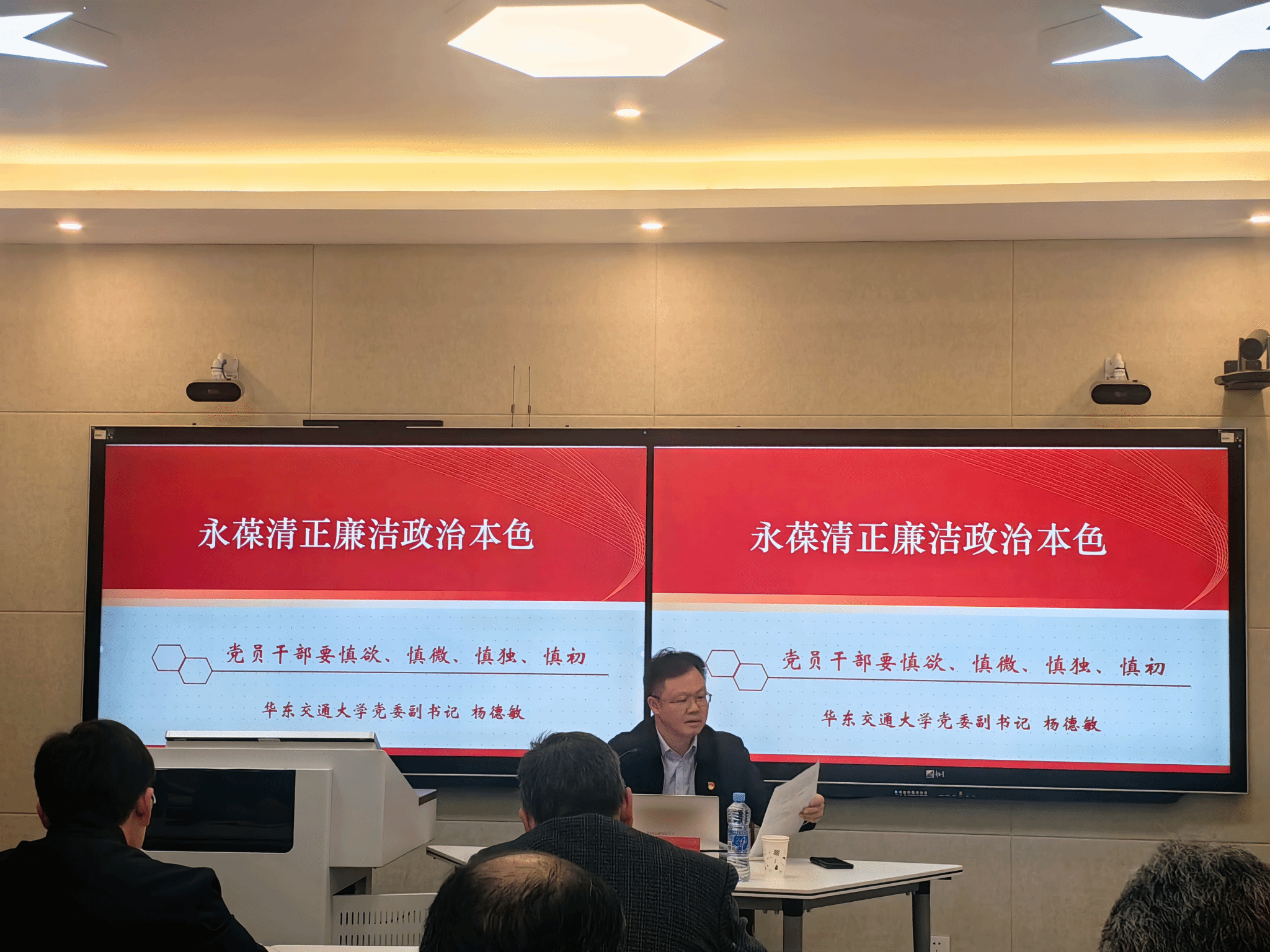 廉政党课上,杨德敏重点对习近平总书记重要文章《推进党的自我革命要做到“五个进一步到位”》进行了解读,并聚焦基建工程、干部选用、职称评聘、师德师风等重点风险领域,结合警示案例,以案说规,推动党纪学习教育融入日常、抓在经常。他指出,党员干部要慎欲、慎微、慎独、慎初,知纪于心,化纪于行,始终绷紧纪律之弦,时刻保持清醒头脑,切实做到一体推进党风政风、师德师风、校风学风建设,让党员干部对如何营造立德树人、风清气正的良好教育生态有个更清晰的认识,为学校高质量发展提供了坚强纪律保障。